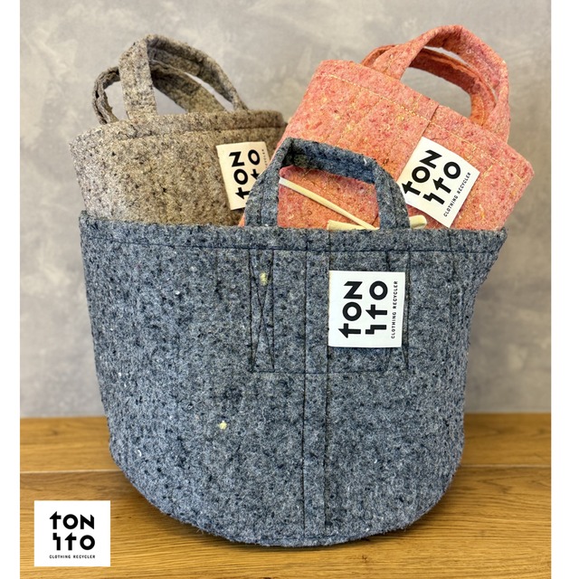 廃棄された古着を暮らしに寄り添った商品へとアップサイクルしている「TONITO(トニト)」の商品が入荷! ★1点購入=1本植林★ studio enishiでご購入いただくと、砂漠の植林活動につながります。 詳細はこちら ↓ https://shop.studioenishi.jp/p/00007 インスタ @studio_enishi_online リビング、デイリーなど様々なライフスタイルに合わせて使えます。 ■例えば、こんな使い方 ・車から荷物を運ぶ時に:たくさん入れて運べるトートバッグとして。 ・仕事の書類の一時保管に:オフィスでも便利に使えます。 ・服の模様替えに:着ない服をくるくる畳んで縦に収納。 ・大きな観葉植物を入れに:掃除の時も移動が可能。 様々な衣類の素材を使用したリサイクルフェルト。 色ごとに分別した廃棄衣類の生地をフェルト化し、新たな商品として生まれ変わりました。 あえて衣類の繊維感を残したディテールが特徴で、ひとつひとつ異なる表情を持つ、世界に一つだけのアイテムです。 生地表面にはでこぼことした立体感があり、繊維の質感も一点一点異なるため、表情の違いを楽しめます。 見た目に反してとても軽く、複雑に絡み合った繊維によって、しっかりとした強度も兼ね備えています。 サイズ展開により、さまざまな用途でご使用いただけます。 製造国:日本 原材料・素材: リサイクル繊維60%、 リサイクルポリエステル20%、 ポリエステル20% 色:チャコール サイズ:Lサイズ 直径36㎝ 高さ30cm ※表面に施しているコーティングの劣化を防ぐため、洗濯は基本的に避けていただくようお願いいたします。 ※長期に渡って、紫外線が直接当たる使用は控えてください。 ※1点1点繊維の出方は異なります。 ※折り畳んで梱包しており、畳みしわがはじめはありますが、少しずつ解消していきます。 【TONITO】 大阪・泉佐野市にて60年以上続く故繊維業を営んでいる企業。 主に国内古着の年々増加する廃棄衣料を選別する中で、もったいない古着を原料に一つの形として商品を残したい、国内古着を資源にできないか。 その情熱を日々忘れずに仕事に取り組んでいます。 廃棄されてしまう衣料で作られた商品は世の中にたくさんありますが、TONITOでは、素材またはプロダクトに対してリサイクル率の高い物作りを目指しています。 TONITOは色分けをし、染めずに服の色を生かしオリジナルのカラーの配色で製作しています。