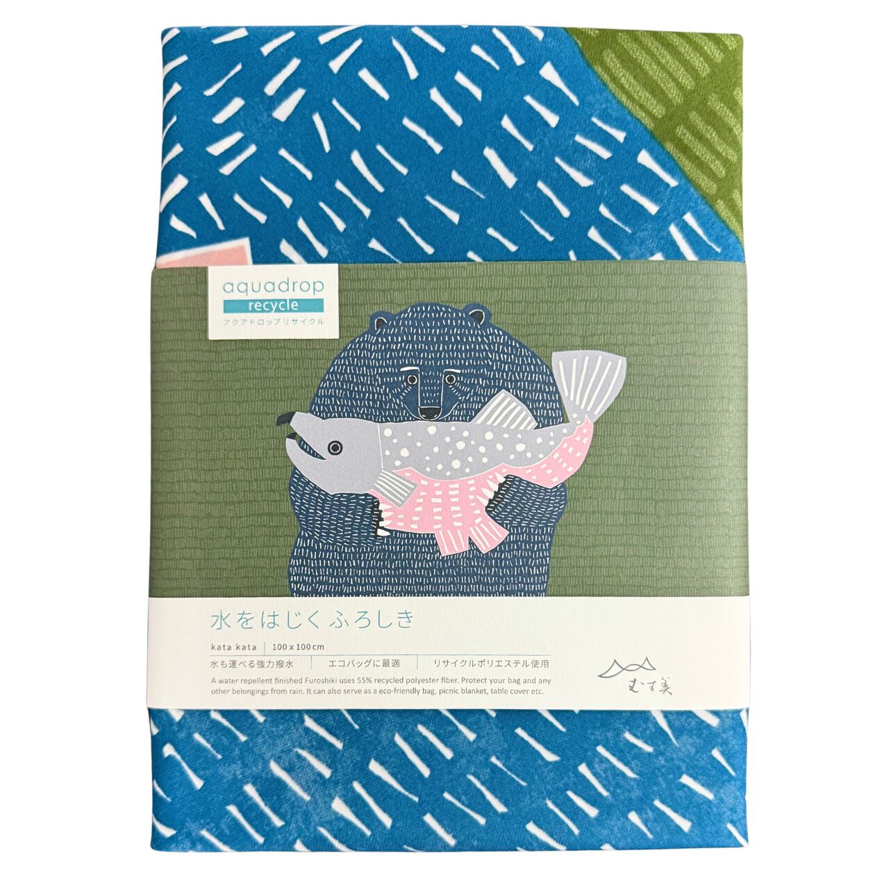 柄は、クマが鮭をプレゼントしている様子を描いており、そのデザインから御祝いのギフトにもよく選ばれています。