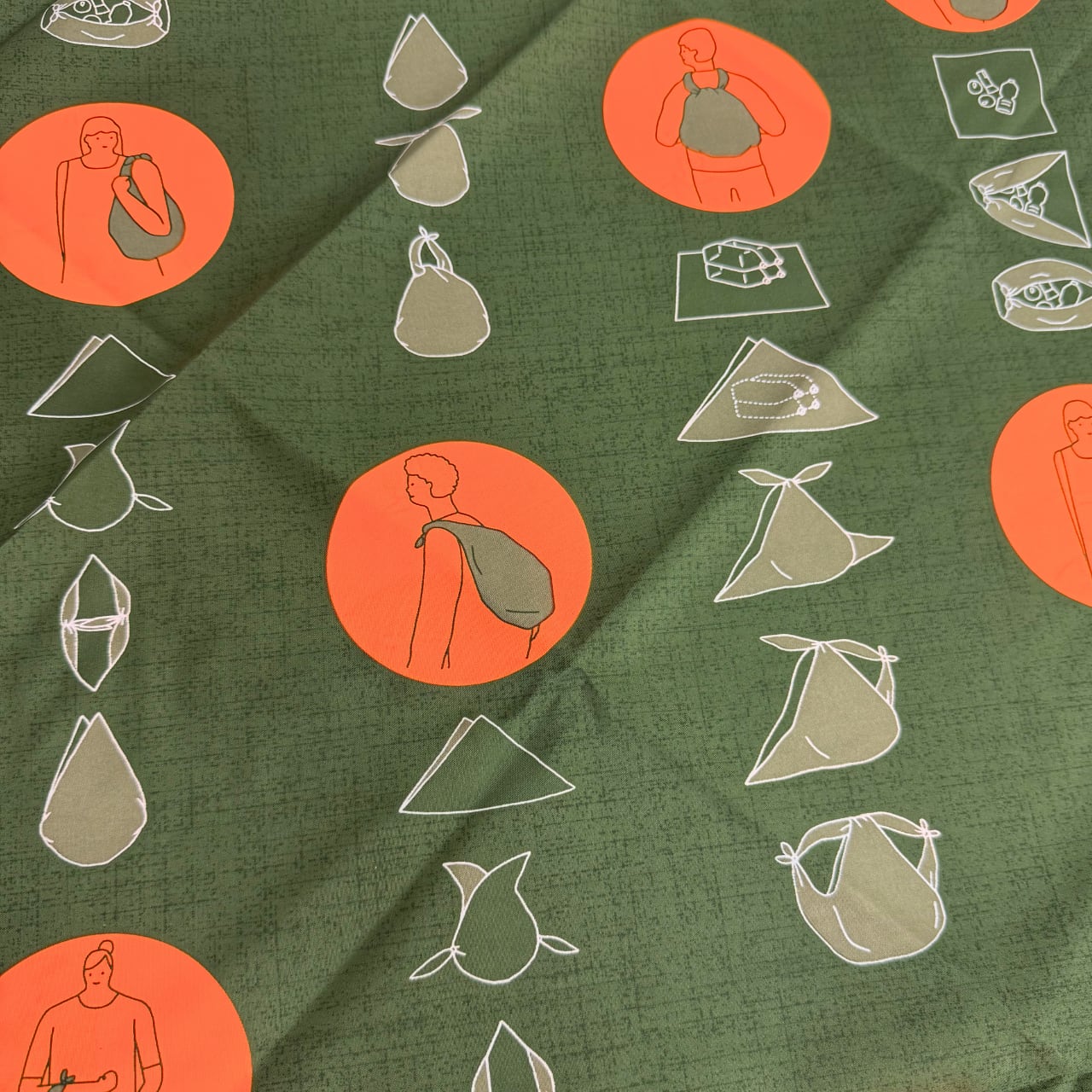 ■防災ふろしきはリュックや三角巾、など、災害時に役に立つ12種類の使い方を模様にしています。