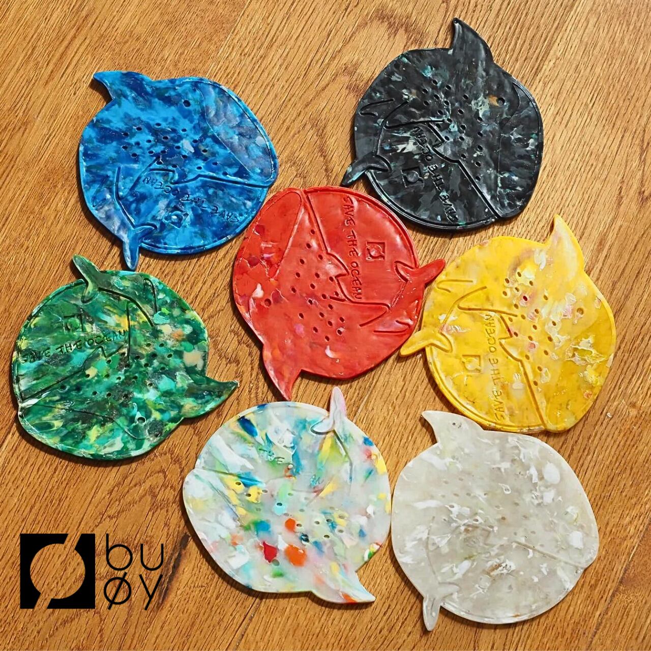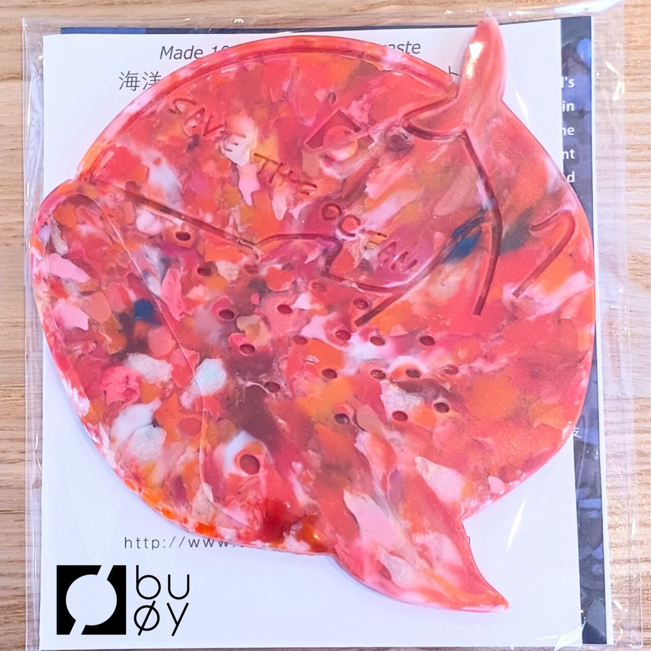 海洋プラスチックごみを材料に変えるブランドbuoy(ブイ)の、海洋生物のコースター「ジンベイザメ」。