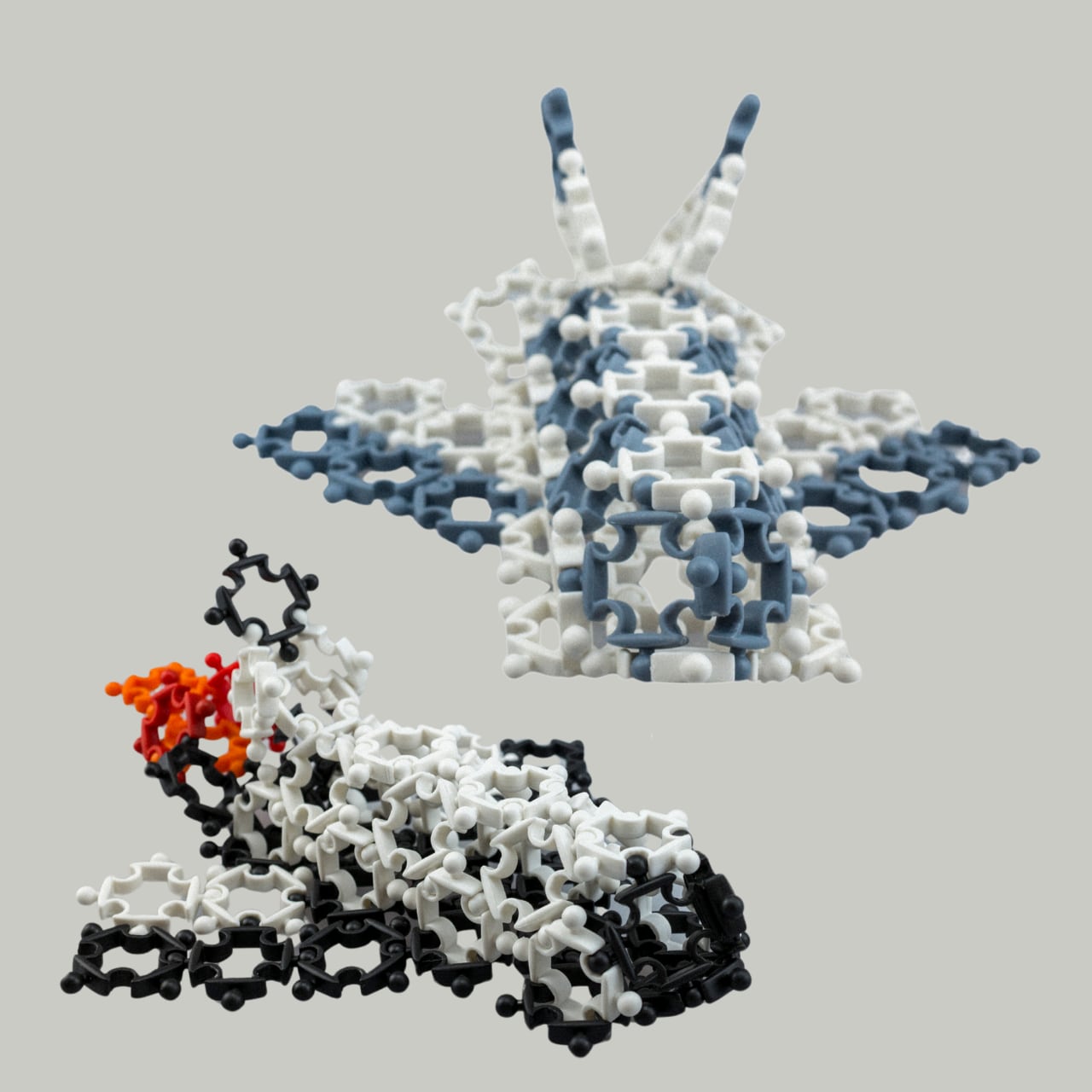 繋げて、曲げて、捻って、丸めて、自由自在に形が作れ、作った後も形を変えて楽しめる新感覚のブロック玩具。